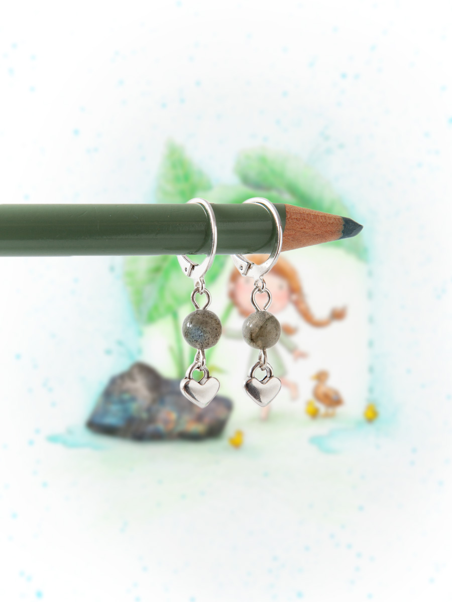 De oorbellen zijn door Mooqi handgemaakt van Designer Quality silver plated metalen onderdelen, nikkelvrij. Gecombineerd met 6 mm Labradoriet kralen en silver plated hartjes. Het oorringetje is 12mm in doorsnede en heeft een karabijnsluiting.