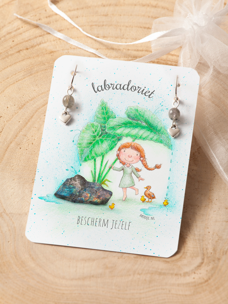 Natuurlijk ontvang je de oorbellen samen met een Mooqi edelsteen mini kaart Labradoriet. Het zilver is met een zilverpoetsmiddel te reinigen.