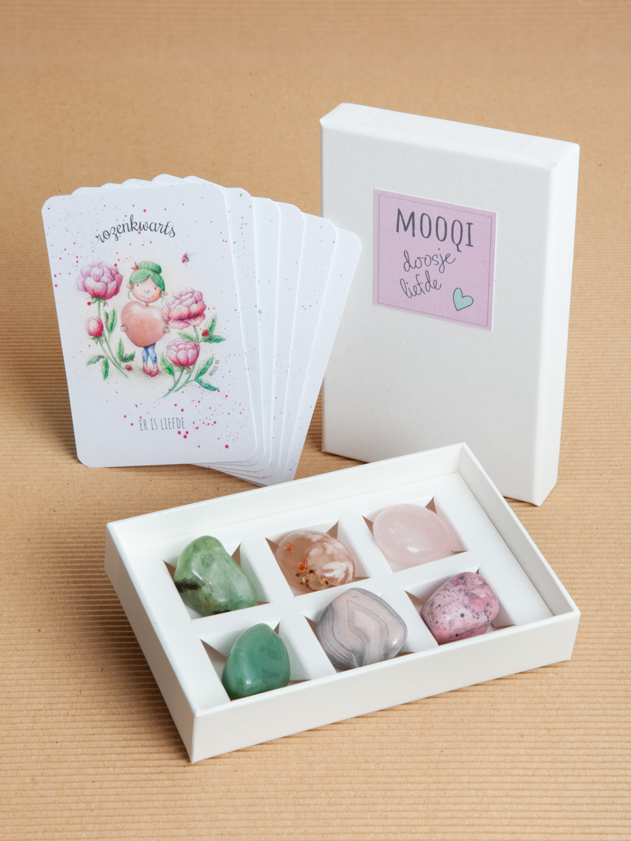 Zes stenen met zes bijbehorende Mooqi kaartjes in een schattig doosje met een liefdevolle uitstraling: