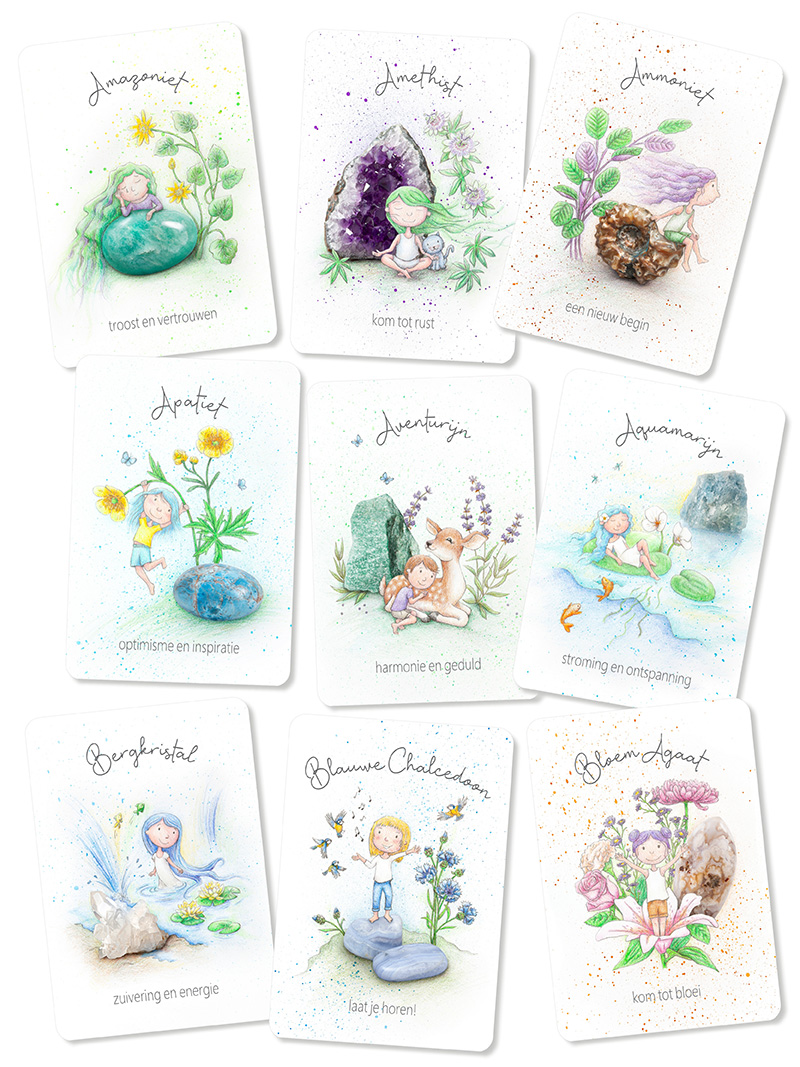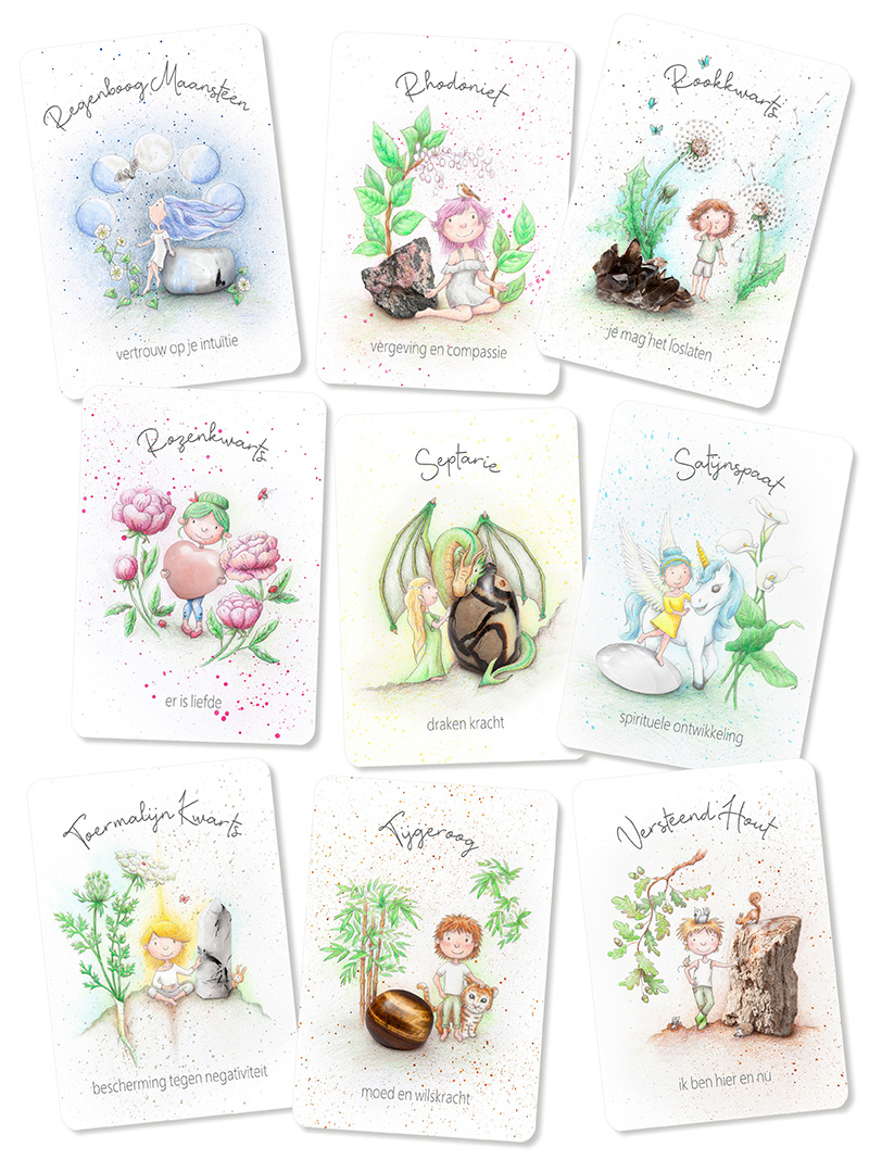 De kaarten zijn groter van formaat dan de mini kaartjes, namelijk 9 x 13 cm. En ze zijn voorzien van dubbelzijdige full colour bedrukking en matlaminaat. Op de achterzijde van alle kaarten staat een tekening met een groen kristal omgeven door bloemen.